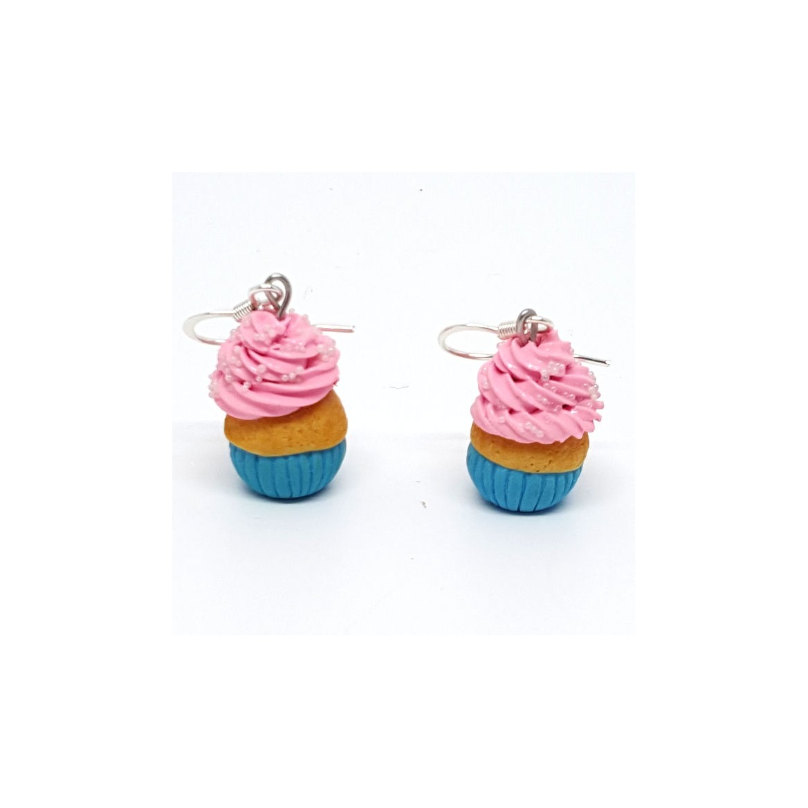 Aretes en forma de cupcake con base celeste, betún de fresa y chispas blancas 100% hechas y pintadas a mano.